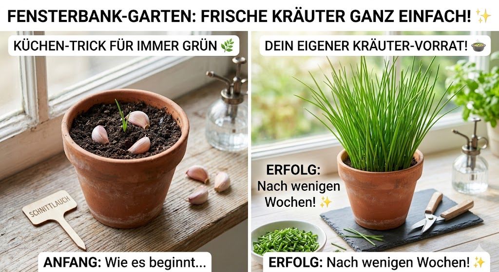 Möchtest du frische Kräuter zum Kochen, direkt griffbereit in deiner Küche? Du brauchst dafür keinen Garten und keinen grünen Daumen! Mit dieser einfachen Methode verwandelst du deine Fensterbank in eine grüne Oase und sparst Geld für teure Kräuterbünde aus dem Supermarkt.