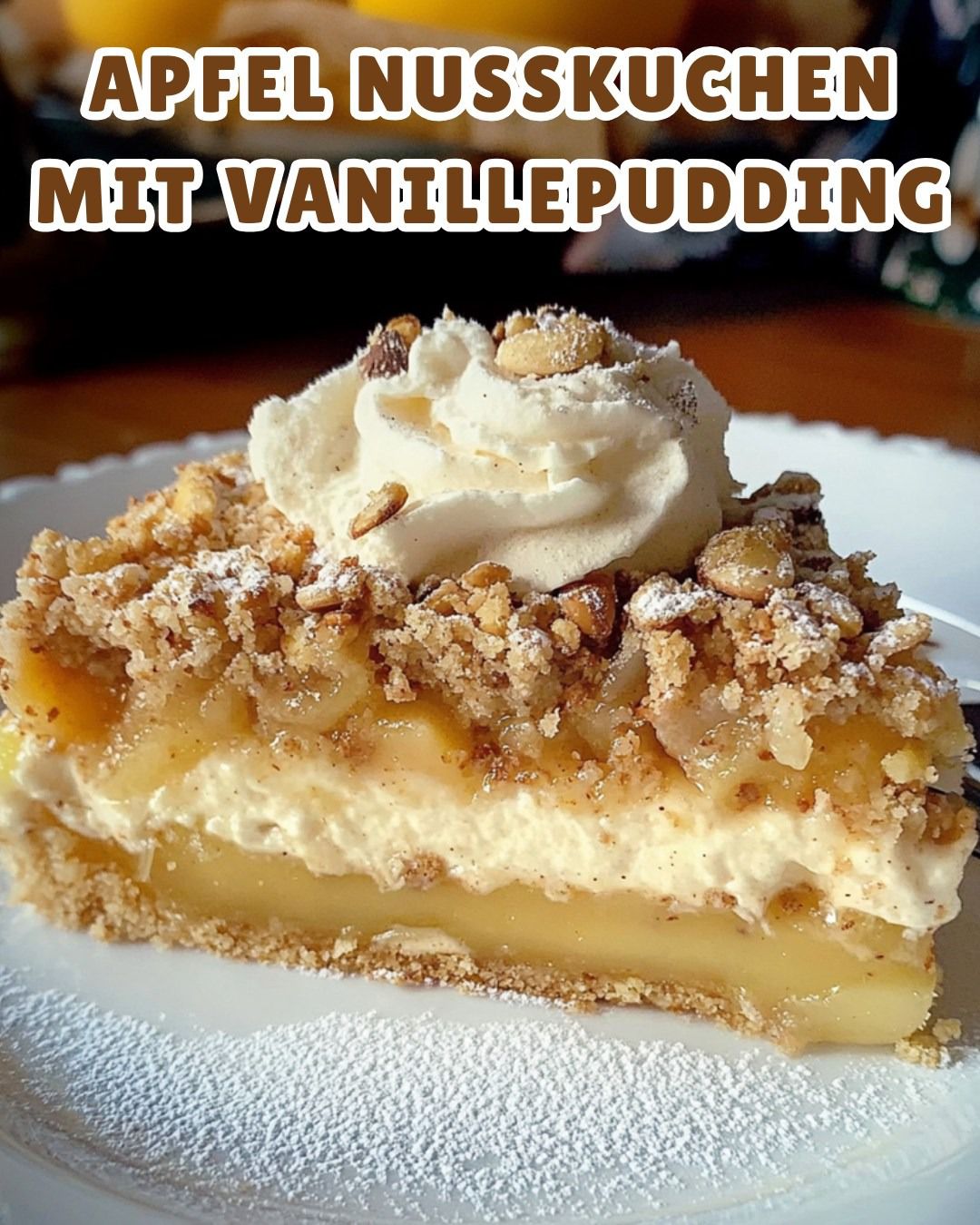 Saftiger Apfel-Nusskuchen mit Vanillepudding und Streuseln – fruchtig, cremig und knusprig.