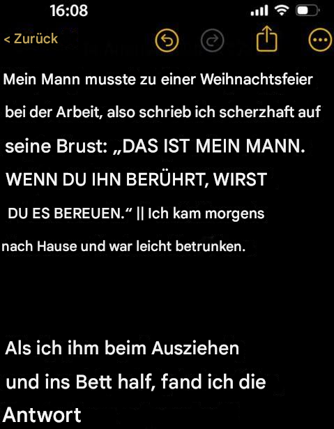Vor der Weihnachtsfeier der Firma habe ich eine lustige Nachricht auf die Brust meines Mannes geschrieben und eine unerwartete Antwort erhalten.