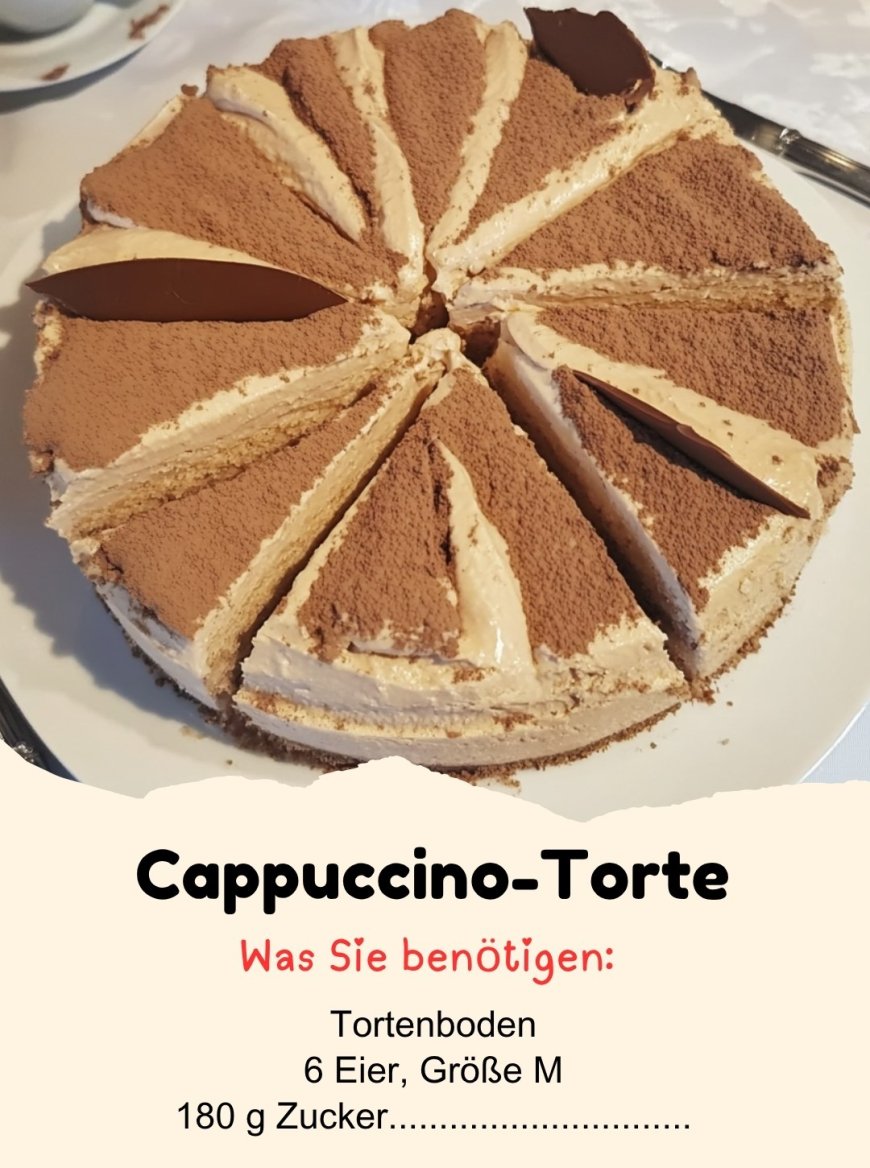 Eine Cappuccino-Torte ist die perfekte Wahl für alle, die den intensiven Geschmack von Kaffee mit einer cremigen, zarten Süße verbinden möchten. Diese besondere Torte vereint luftigen Biskuitboden mit einer aromatischen Cappuccino-Creme und sorgt so für ein harmonisches Geschmackserlebnis. Der feine Espresso-Geschmack verleiht ihr Tiefe, während die sahnige Füllung für Leichtigkeit sorgt. Ob für Geburtstage, Gäste oder den Kaffeetisch am Wochenende – diese Torte ist immer ein Highlight.