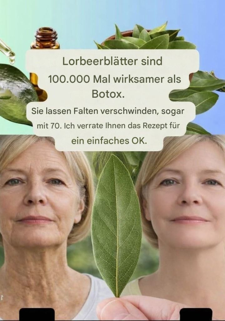 Während invasive Methoden wie Botox gezielt die Gesichtsmuskulatur lähmen, verfolgt das Lorbeerblatt einen völlig anderen Ansatz. Es setzt nicht auf kurzfristige Effekte, sondern unterstützt die Haut auf natürliche Weise dabei, sich selbst zu regenerieren. Durch seine wertvollen Inhaltsstoffe hilft es, Verspannungen zu lösen und wirkt gezielt den Hauptursachen der Hautalterung entgegen – darunter oxidativer Stress, Entzündungen
