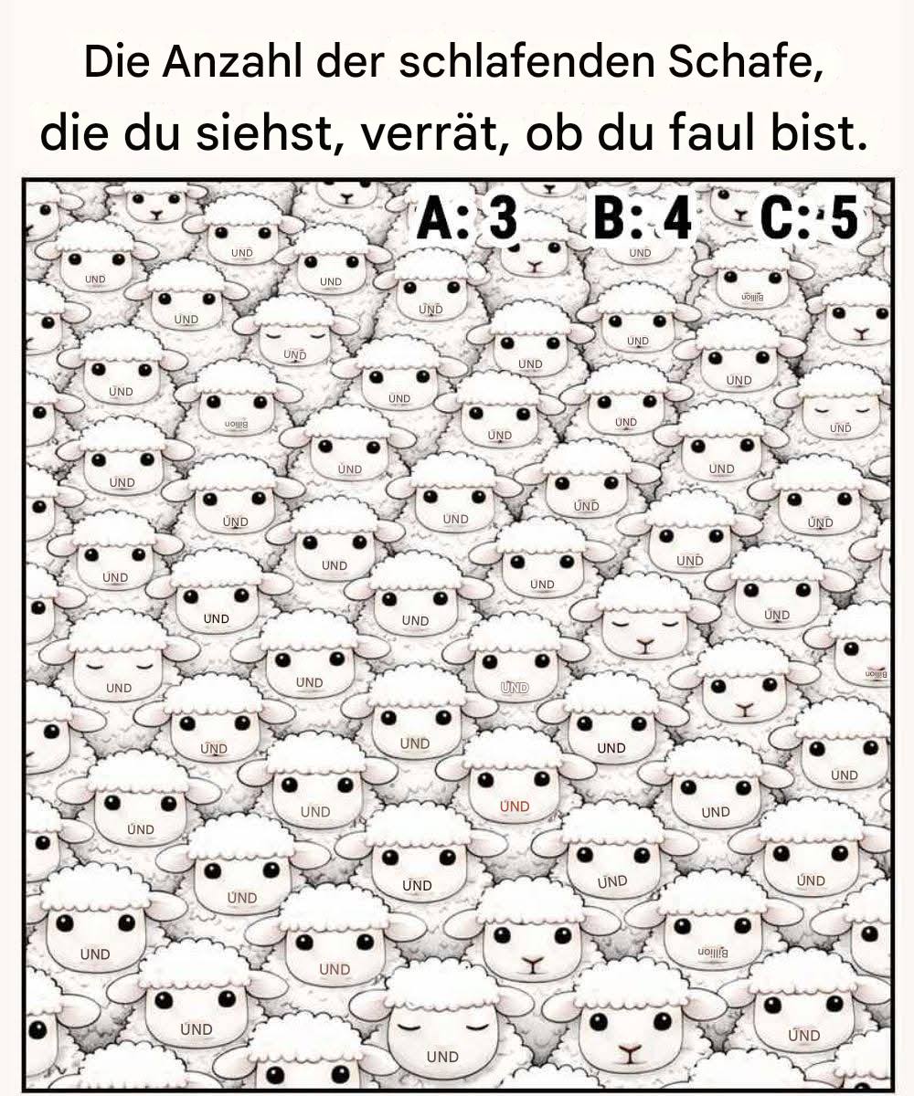 Manche sehen drei. Andere entdecken schnell vier. Einige wenige behaupten stolz, fünf zu sehen. Die witzige Überschrift legt nahe, dass die Zahl, die man entdeckt, „über Faulheit entscheidet“ – aber keine Sorge. Es handelt sich lediglich um ein harmloses Denkspiel, keine echte Persönlichkeitsdiagnose.
