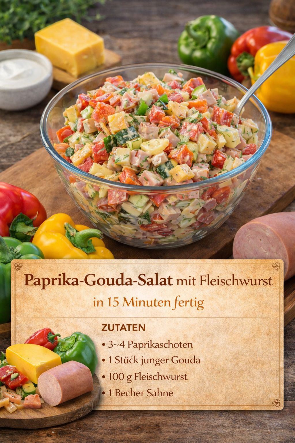 Die Paprikaschoten werden gründlich gewaschen und vom Kerngehäuse befreit. Anschließend die Paprika und die Tomate in mundgerechte Stücke schneiden. Den Gouda ebenfalls würfeln, die Menge kann dabei je nach Geschmack angepasst werden, und zusammen mit der Paprika in eine große Schüssel geben. Die Zwiebel und die Fleischwurst fein würfeln und ebenfalls hinzufügen.