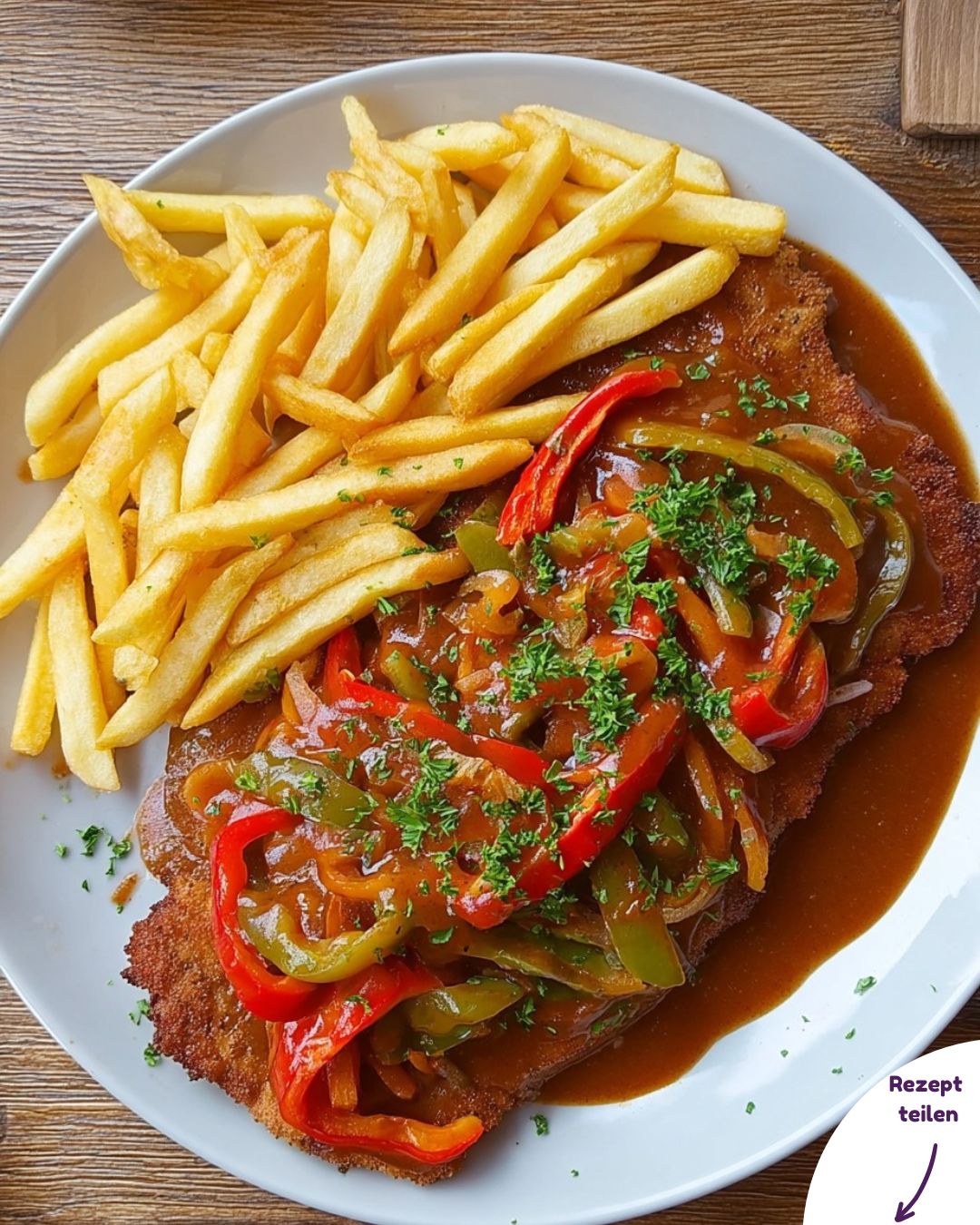 Dieser Teller macht dich glücklich, Schnitzel mit Paprikasoße und Pommes