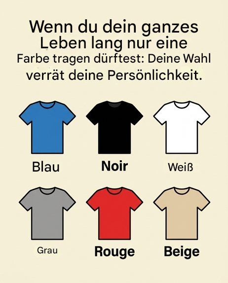Was wäre also, wenn Ihre Garderobe für immer auf eine einzige Farbe reduziert wäre? Keine Muster, keine spontanen Kombinationen, kein morgendliches Zögern vor dem Kleiderschrank. Nur eine Farbe – jeden Tag, in jeder Situation.