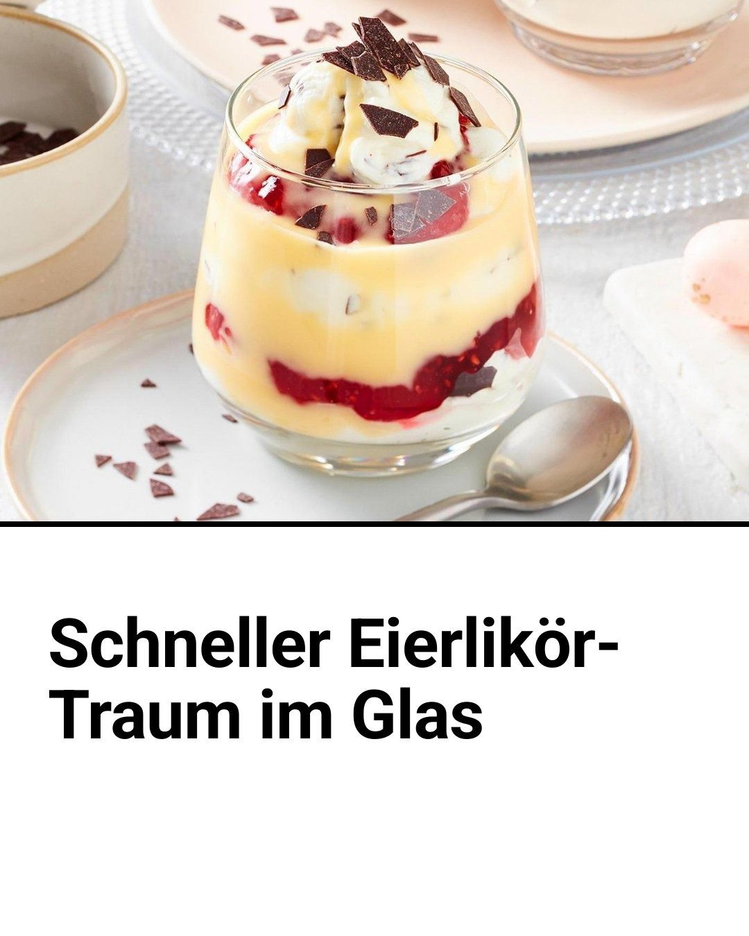 Omis Eierlikör ist eine der besten Zutaten, um damit ein schnelles cremiges Dessert zu machen. In unseren Eierlikör-Traum kommt der Klassiker zwischen himmlische Schichten aus Mascarpone-Sahne-Quark, Himbeerkonfitüre und Schokoraspel. Wow!