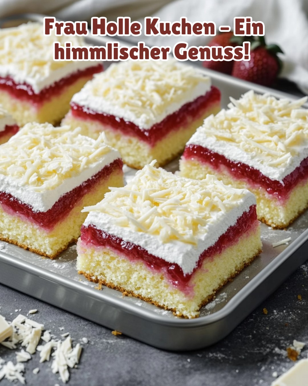 Als Konditormeisterin, die jahrelang in verschiedenen deutschen Konditoreien gearbeitet hat, hat mich kaum ein Kuchen so verzaubert wie der traditionelle Frau Holle Kuchen. Mit seinem luftigen Biskuitboden, der fruchtigen Erdbeerschicht und der lockeren Sahnehaube, die von weißen Schokoladenflocken bedeckt ist, erinnert er tatsächlich an frisch gefallenen Schnee aus dem beliebten Grimm’schen Märchen.