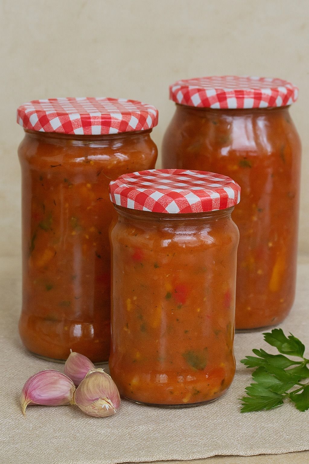 Hausgemachter Lecho mit Zucchini in Gläsern für den Winter