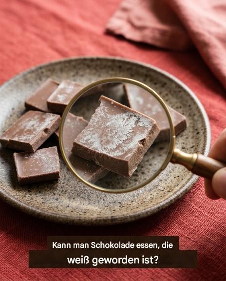Auch weiß gewordene Schokolade ist noch genießbar. Diese Veränderung betrifft lediglich Aussehen und Konsistenz, nicht aber die Gesamtqualität des Produkts.