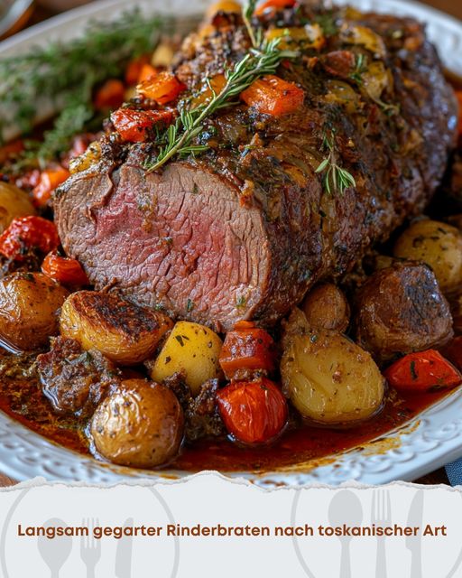Ein langsam gegarter Rinderbraten nach toskanischer Art ist ein köstliches Schmorgericht, das durch seine intensiven Aromen und seine zarte Konsistenz begeistert. Inspiriert von der traditionellen italienischen Küche, kombiniert dieses Rezept hochwertiges Rindfleisch mit frischen Zutaten wie Zwiebeln, Möhren, Sellerie und Knoblauch. Durch das langsame Schmoren in einer aromatischen Sauce aus Rinderbrühe, Tomaten und mediterranen Kräutern wie Rosmarin und Thymian wird das Fleisch unglaublich zart und saftig.