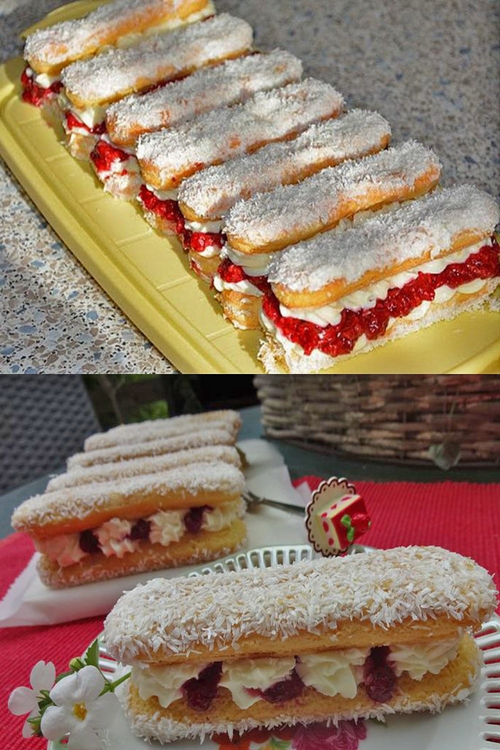 Die Hälfte der Löffelbiskuit mit Mascarpone bestreichen und die zweite Hälfte auf den bestrichenen fest drücken. Dann die Biskuitstangen kurz in Sahne tauchen und in Kokosraspeln wälzen.