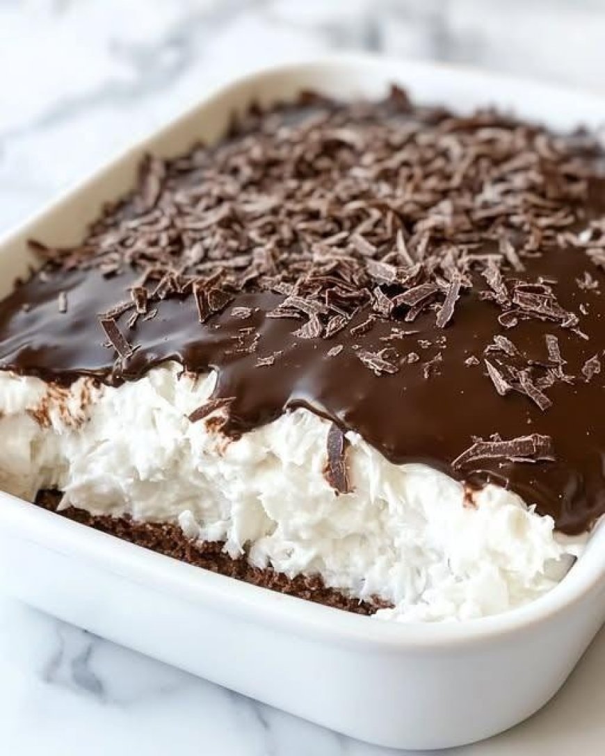 Dieser No-Bake-Schokoladen-Kokos-Kuchen besteht aus einer aromatischen Kokosbasis und einer zarten Schokoladenschicht. Die Kokosmischung wird aus Kokosraspeln, Kokosmilch, Ahornsirup und Vanille zubereitet, in eine Form gedrückt und gekühlt. Anschließend wird geschmolzene dunkle Schokolade mit Kokosöl darüber gegossen und erneut gekühlt, bis sie fest ist. Nach dem Aushärten wird der Kuchen in Scheiben geschnitten und kann mit Kokosraspeln oder Nüssen garniert werden. Er ist eine schnelle, köstliche und unkomplizierte Leckerei für jede Gelegenheit!