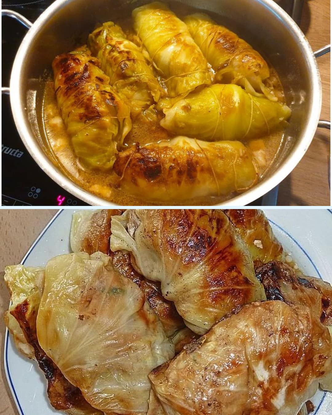 Zuerst den Kohlkopf gründlich waschen. Acht schöne Blätter vom Wirsing oder Weißkohl vorsichtig ablösen. Um die Blätter weich und biegsam zu machen, blanchiere sie in kochendem Salzwasser für etwa 2–3 Minuten. Danach sofort in Eiswasser abschrecken, damit sie ihre Farbe behalten. Die Blätter auf einem Küchentuch vorsichtig abtrocknen.