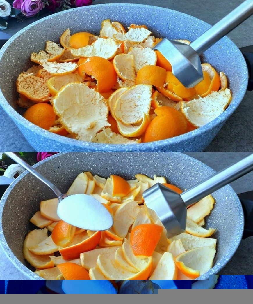 Um dieses Rezept erfolgreich zu machen, müssen Sie einen Topf nehmen und etwa einen Liter Wasser und die Orangenschalen hineingießen. Dann einfach die Esslöffel Salz und den Esslöffel Natron hinzufügen und dann gut vermischen.
