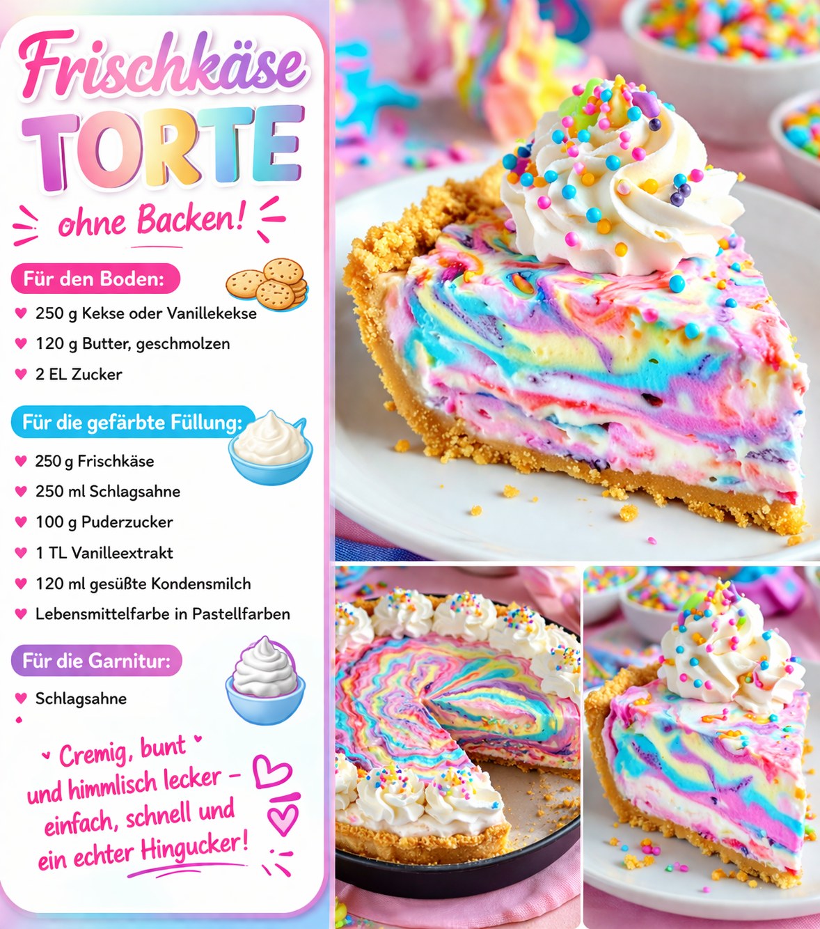 Die Kombination aus knusprigem Keksboden und einer luftigen Frischkäse-Sahne-Füllung sorgt für eine herrlich cremige Konsistenz. Die bunten Farbswirls erinnern an Ostereier und machen den Kuchen zu einem echten Hingucker auf jeder Oster-Kaffeetafel. Besonders Kinder lieben die fröhlichen Farben, während Erwachsene den milden, cremigen Geschmack genießen.