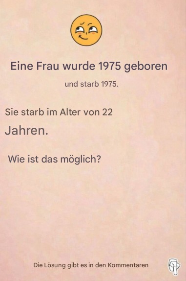 Stellen Sie sich vor: Sie stoßen beim Durchscrollen der Nachrichten auf diesen seltsamen Satz: „Eine Frau wurde 1975 geboren und starb 1975. Sie war 22 Jahre alt.“ Plötzlich erstarren Sie. Unverständlich? Beunruhigend? Da muss doch irgendwo eine Falle sein … aber wo? Halten Sie sich gut fest, denn dieses Rätsel stellt unsere Logik, unsere Reflexe und eine gehörige Portion Fantasie auf die Probe. Was wäre, wenn der Schlüssel nicht darin bestünde, wie gewohnt zu denken?