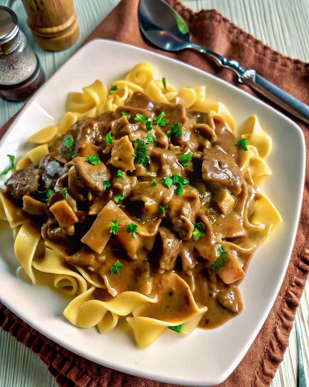 Dieses herzhafte Rezept kombiniert zartes Rindfleisch, eine reichhaltige Sauce und klassische Ei-Nudeln zu einem wärmenden Gericht, das perfekt für kühlere Tage ist.