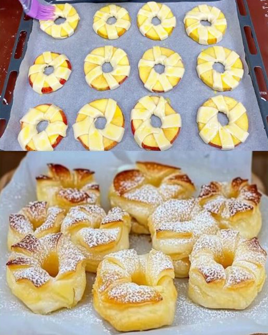 4. Die Apfelringe auf die Blätterteigstreifen legen, sodass sie sich leicht überlappen, und dann die Streifen vorsichtig aufrollen, um eine Rosenform zu erhalten.