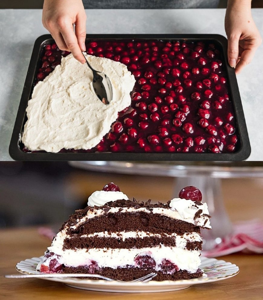Wer kann schon einem Stück Schwarzwälder Puddingkuchen widerstehen? Dieses Rezept ist die perfekte Kombination aus saftigem Schokoladenboden, fruchtigen Kirschen, zarter Schlagsahne und einem Hauch von Schokoladenraspeln – alles auf einem großen Backblech, das genug für die ganze Familie oder für Gäste bietet.