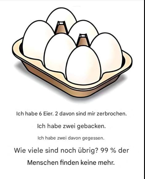 Die richtige Antwort lautet deshalb: Vier Eier bleiben übrig.