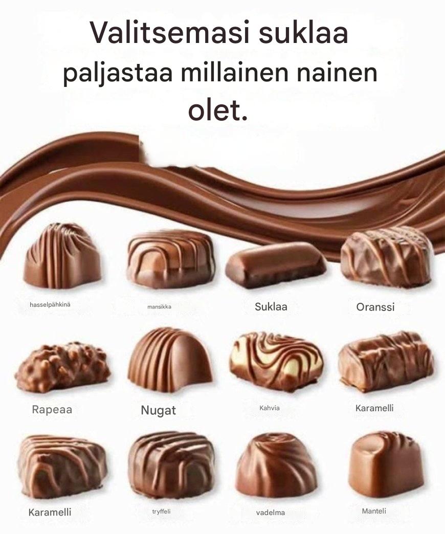 Se saattaa tuntua yksinkertaiselta makeanhimoiselta, mutta suklaatyyppi, josta pidät, voi itse asiassa paljastaa paljon persoonallisuudestasi. Oletko rohkea ja uskalias? Rauhallinen ja voimakas? Lämmin ja välittävä? Suklaavalinnastasi voi löytyä vastaus.