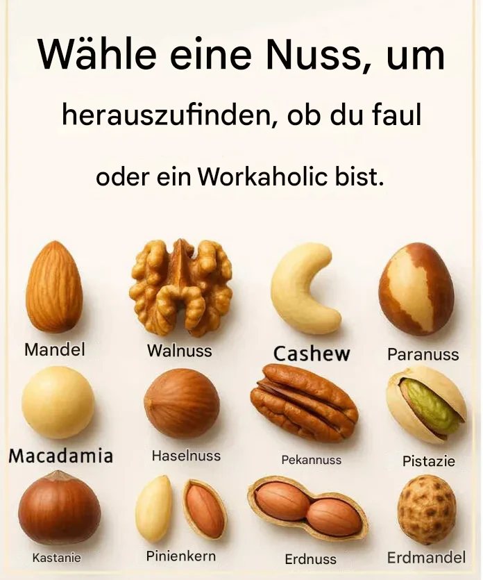 Wähle eine Nuss, um herauszufinden, ob du faul oder ein Workaholic bist. Man sagt, man sei, was man isst. Aber was wäre, wenn Ihr Lieblingssnack nicht nur Ihren Geschmackssinn, sondern auch Ihre Arbeitsgewohnheiten, Ihren Persönlichkeitsstil und Ihre Lebensweise offenbaren könnte? Es mag überraschend klingen, aber Psychologen weisen oft darauf hin, dass unsere Entscheidungen – selbst kleine – tiefere Wahrheiten über uns widerspiegeln können. Die Lebensmittel, nach denen wir uns sehnen, können Aufschluss darüber geben, ob wir überarbeitet, unterbewertet oder im perfekten Gleichgewicht sind. Hier ein kleiner Test: Wähle deine Lieblingsnuss aus der Liste unten. Mandel – Der Überflieger. Wenn Mandeln Ihr Lieblingssnack sind, kennen Sie wahrscheinlich die Bedeutung von „entschleunigen“ nicht. Sie blühen auf, wenn Sie Struktur, Ziele und die nie endende To-do-Liste brauchen. Du bist der Typ, der vor dem Wecker aufwacht und schon an Aufgaben denkt. Arbeitsstil: Hochkonzentriert, organisiert, immer auf den nächsten Meilenstein ausgerichtet. Was Sie hören sollten: Ausgeglichenheit ist keine Schwäche. Walnuss – Der stille Geber. Walnussliebhaber sind die stillen Helden. Sie prahlen nicht mit ihren Erfolgen, sondern geben und geben – Zeit, Energie, Mitgefühl – ohne zu zögern. Du bist diejenige, die immer früh da ist, um zu helfen, lange bleibt, um aufzuräumen, und sich nie beschwert.Ti.p.pen Sie auf das F.oto, um das voll.ständige Rezept anz.uzei.gen
